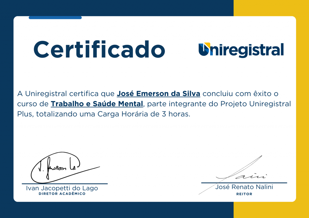 Após a conclusão do curso Trabalho e Saúde Mental, você receberá um certificado digital, validando sua participação e aprendizado. Nossa plataforma acompanha o progresso das aulas e verifica se você assistiu a todo o conteúdo disponibilizado.